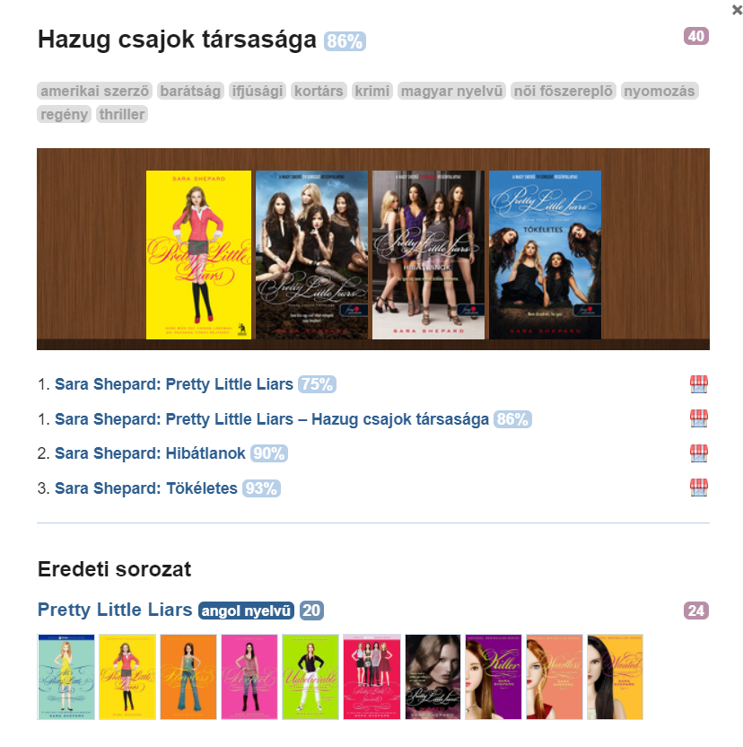 A Pretty Little Liars (azaz a Hazug Csajok Társasága) sorozatból, 20 könyv jelent meg angol nyelven, magyarul pedig 3 (a többi részt még fordítják). Aki nem látta a műsort, annak a könyvek nem lesznek túl izgalmasak, mondjuk nekem sem volt az. Egyáltalán nem részletes, nehéz elképzelni, hogy mi történik éppen. Ebben az esetben a könyv maradt alul... :(